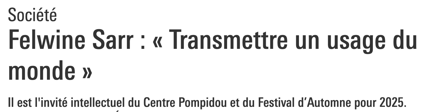 Né en 1972 à Niodior (Sénégal), FELWINE SARR est écrivain et universitaire. Agrégé en économie, il enseigne les humanités africaines à l’université de Duke, en Caroline du Nord. Il a publié Dahij (Gallimard, 2009), Méditations africaines (Mémoire d’encrier, 2012), Afrotopia (Philippe Rey, 2016), Habiter le monde (Mémoire d’encrier, 2017), Les lieux qu’habitent mes rêves (Gallimard, 2022 ; Zulma, 2024), ainsi que Le bouddhisme est né à Colobane (Philippe Rey/Jimsaan, 2024).